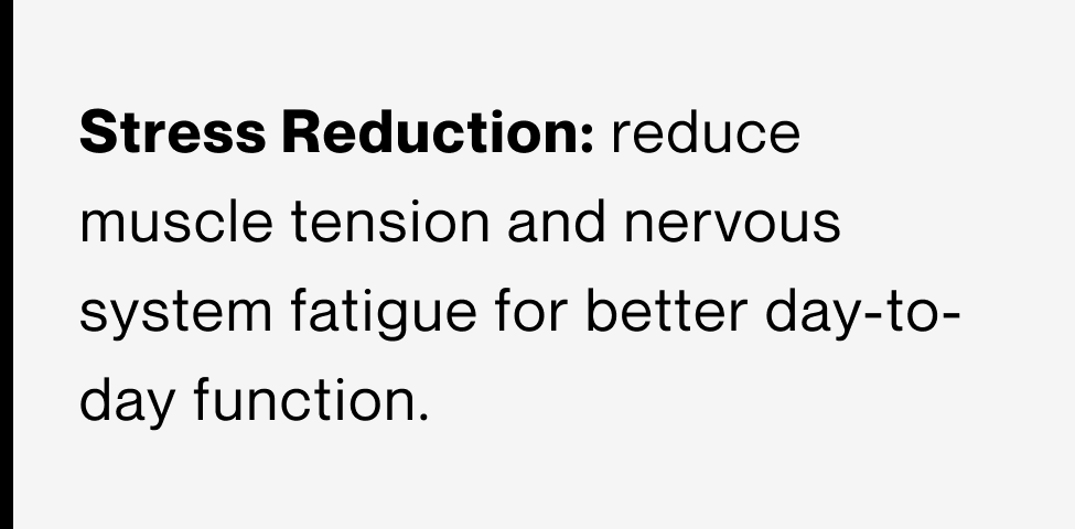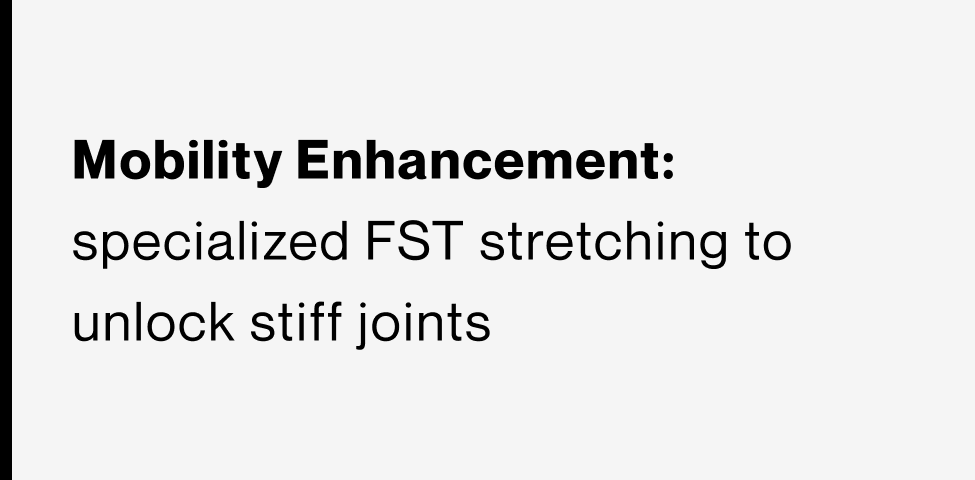 FST + STR is a comprehensive hands-on treatment that combines assisted stretching with targeted soft tissue techniques to improve mobility, reduce pain, and restore optimal movement. By addressing restrictions in the fascia and surrounding muscles, this treatment helps decrease stiffness, improve flexibility, and enhance joint range of motion. Gentle, pain-free assisted stretches are used to decompress joints and improve circulation, while soft tissue release techniques focus on areas of tightness, tension, and adhesions. This treatment is ideal for individuals experiencing chronic muscle tightness, limited mobility, postural strain, or physical stress from work, sport, or daily activities.