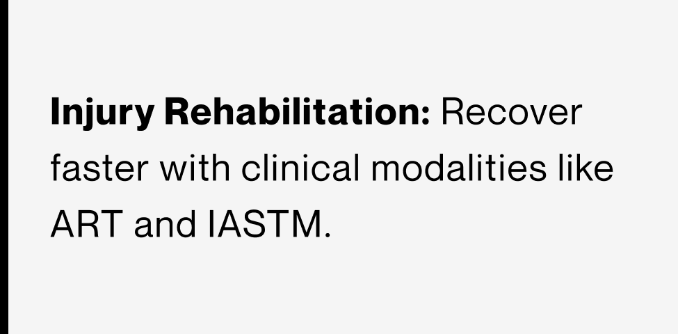 ART + IASTM is a targeted, hands-on treatment that combines precise manual therapy with specialized instruments to address muscle tightness, scar tissue, and soft tissue restrictions. Active Release Technique uses specific movements and tension to break down adhesions and restore normal tissue function, while Instrument Assisted Soft Tissue Mobilization enhances tissue healing by improving circulation and mobility. This treatment is effective for reducing pain, improving range of motion, and treating overuse injuries, repetitive strain, chronic tension, and movement restrictions, making it well suited for individuals dealing with sports-related injuries or persistent muscle tightness that keeps coming back.