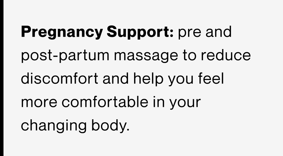 Pregnancy massage therapy is designed to support your body through the physical changes of pregnancy and the recovery period after birth. It can help ease common areas of discomfort like the low back, hips, glutes, legs, feet, and upper back and neck, while also supporting circulation and overall comfort. Whether you are looking for relief from day-to-day aches during pregnancy or you need post-partum support for tension from feeding positions, carrying, and sleep changes, your session is tailored to help you feel more comfortable and supported.